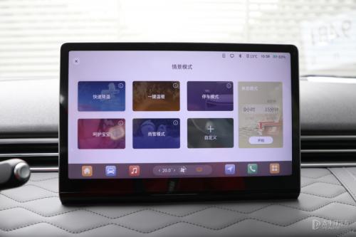 车内的12.8英寸中控大屏界面有安卓平板的味道。内置在线导航、在线音乐等基础功能。其次系统内置五种情景模式,分别是“快速降温”、“一件温暖”、“停车模式”、“呵护宝宝”和“雨雪模式”。最后车主可以通过语音功能控制车内绝大部分功能,语音功能识别度和反应都OK,完全不用担心缺少物理按键而感到不方便。