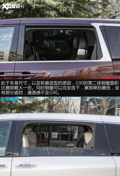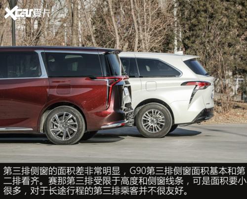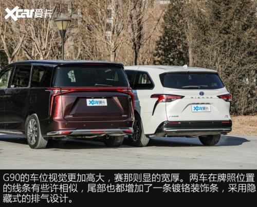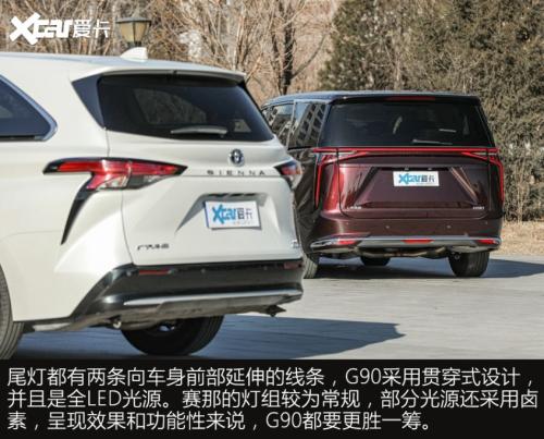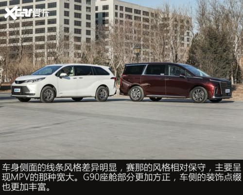G90和赛那在外观设计上,都展现出各自品牌家族鲜明的风格,赛那所呈现的整体感觉,居家的标签会更加鲜明,反观G90的商务气要浓了很多。外部配置上两车差异不大,主要体现轮胎上,其它功能性、便利性配置,G90的表现略好于赛那。