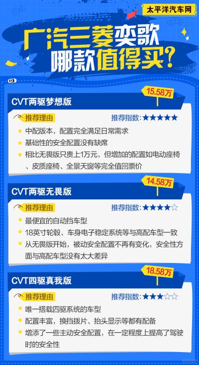 奕歌的车身长度为4405mm,介于欧蓝德与劲炫之间,1685mm的车身高度让它成为三者中最高的一个。值得注意的是奕歌的轴距同样为2670mm,但是全系并未提供7座版车型。奕歌的价格区间为12.98-18.58万元,共有五款车型,其中顶配车型搭载了S-AWC超级全轮控制系统,而最低配采用手动变速箱。关于各车型的配置和性价比的分析,可参考《广汽三菱奕歌购车手册》。
