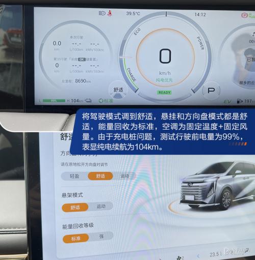 那么广汽传祺E9在电量充足和亏电的状态下,加速会有明显的不同吗?虽然作为一台多人出行的MPV,舒适性会是第一需求,但是在高速超车,整台车的加速能力和底气也是车主朋友十分关心的一点。首先我们把试驾车的电池电量充到70%左右,将车内空调关闭且关闭车辆TCS系统。