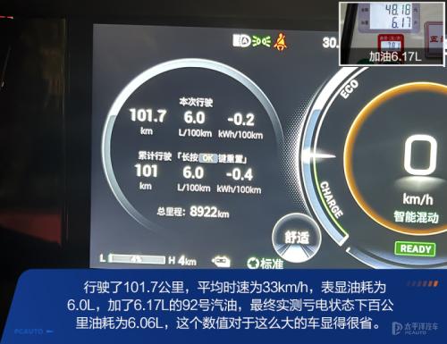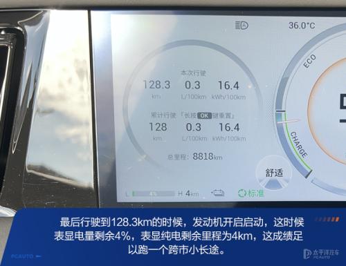 纯电续航测试过后,我们紧接着进行亏电油耗测试。有些消费者充电条件不方便,并且插混车型对比油混甚至纯汽油版本车型由于背负一块更大的电池,车身重量有明显的增加。保持纯电测试时相同的空调工况,驾驶模式、转向和悬架以及能量回收都保持一致,以4%的电量进行亏电油耗。