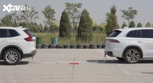 根据之前的规则,此次增加难度,星越L置于10度坡上,CRV为平地,两款车进行拔河比赛。