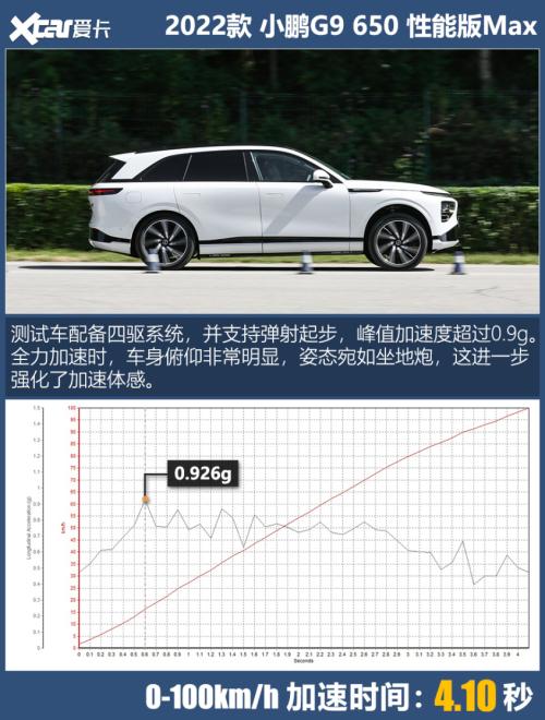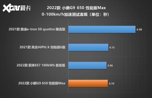 尽管车重超过2.3吨(整备质量2355kg),小鹏G9依旧凭借电动机的强悍输出,取得了出色的加速成绩。在连续10组测试中,该车的0-100km/h加速时间稳定在4.1秒区间,几乎没有出现衰减。需要指出的是,测试时电量仅有50%左右。若在满电条件下进行测试,小鹏G9或许可以跑得更快。