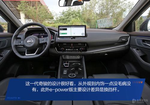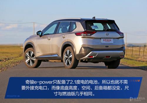 造型上不需要做太多介绍了,这一代奇骏在设计上确实漂亮,之前卖的不好外观可不能背锅。奇骏e-power设计上和燃油版几乎是一模一样,只有几处不太起眼的e-power蓝色标识证明身份。由于它和市面上那些搭载大电池的插电增程车不同,奇骏e-power只配备了2.1度电的电池,所以也就不需要外接充电口,而像底盘高度、空间、后备箱等等尺寸数据也完全没有受到影响。