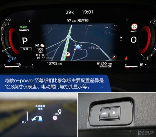 内饰主要的变化除了电子换挡杆几乎没区别,整体风格依旧非常简洁。奇骏e-power目前就两个配置,我们这台是顶配至尊版,相比另外一款豪华版主要的配置差异就是抬头显示、12.3英寸仪表盘、氛围灯、电动后备箱等,像是四驱、日产SafetyShield360与ProPilot驾驶辅助系统都是标配的,不在安全和驾驶辅助上动刀子省成本,确实挺不错。