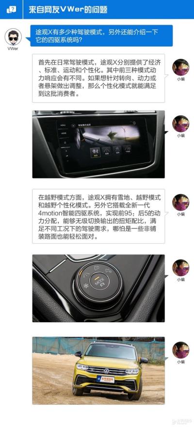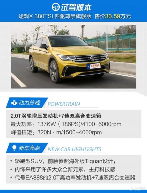 全文总结:途观X在设计上有着很强的运动属性,同时并没有过分追求溜背造型而破坏了整车的设计比例,要比市场上一系列轿跑SUV看起来更加协调,能完全满足当下年轻消费者的审美需求,堪称大众最美的SUV。另外途观X的座舱主打电子化,用起来也十分顺手。然后它的轿跑设计并没有影响到内部乘坐空间。最后2.0T高功率涡轮增压发动机搭配7速双离合变速器的黄金动力组合在日常驾驶中动力输出澎湃,上手难度低,再加上它拥有丰富的驾驶模式,让它在各种路况都能轻松面对。当你面对这款有型又有实力的产品,相信会对它产生动情。(图/文/摄:太平洋汽车网潘洪瀚)