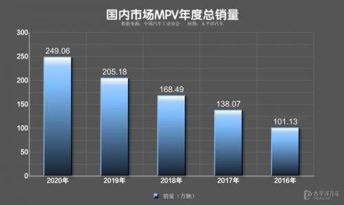 二胎、三胎政策的开放,让MPV的春天被吹了一波又一波。而现实是这几年MPV市场走势不断萎缩,五年前MPV市场还能有10%的市占率,2016年有240万左右销量,而如今MPV市场仅剩5%左右的市占率,2020年的终端销量也跌破100万内。