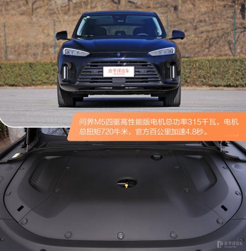 问界M5为增程式电驱车,相比理想ONE它搭载的是一台1.5L四缸増程器,最大发电效率更是达到了3.2kW·h/L,电机方面前桥搭载异步交流电机,后桥搭载永磁同步电机,其中四驱旗舰版总功率365kW,百公里加速4.4秒。而这台四驱性能版总功率315kW,百公里加速4.8秒。