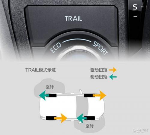 在简单的非铺装路况下,威兰达E-FOUR电子四驱系统也无需切换模式,车辆本身已具备足够好的通过性。而当遭遇高难度越野环境时,按下TRAIL按键,系统会根据四个车轮的转速信号来判断路况,及时对打滑或空转车轮实施制动,把动力通过开放式差速器传递至另一侧有附着力的车轮,大大提升越野性能,TRAIL模式可以看做是一键越野模式,自动程度很高。