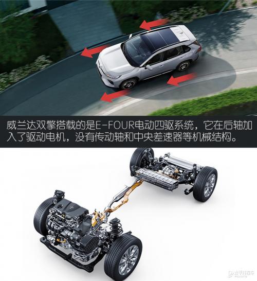 而在双擎版本上,威兰达搭载的是一套完全不同于其他对手的E-FOUR电子四驱系统。它在后轴加入了一个40kW、121N·m的电机专门用于驱动后轮,没有传动轴和中央差速器等机械结构,从而避免了机械部件空转造成的能量损耗。