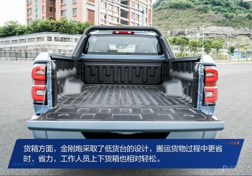 长城金刚炮搭载2.0T汽油发动机或2.0T柴油发动机,全系匹配6挡手动变速箱,汽油版和柴油版均有前置后驱和分时四驱可选,并有标箱、平箱和长箱之分。本次评测主编李喆所体验的具体车型为2.0T手动汽油四驱领航型长箱,官方指导价为11.88万元。