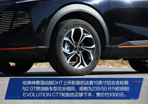 19英寸的铝合金轮毂放在神兽上并不会有大脚怪的感觉,235/55 R19的固铂EVOLUTION CTT轮胎主要还是为了均衡,售价大概在1000元/条,H6S上用的也是这个型号,连规格都一模一样。
