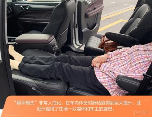 座椅配置方面,传祺M6 PRO无疑遥遥领先同价格车型。其最大亮点是第二排的独立座椅,这对座椅分别配备了4级调节扶手,可前后滑移,并设有双弧面蝶翼式设计头枕,侧翼可防止睡眠时头部侧倾。第一排座椅椅背放倒后,还能与第二排座椅的座垫拼接形成一张足够水平的“床”,实现专属的“躺平模式”。此设计赢得了在场的一众媒体和车主的盛赞。