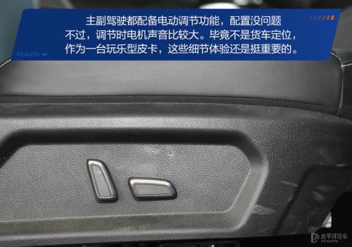 内饰的功能比较完备,舒适性和娱乐性配置都能满足日常使用,比如10.1英寸液晶屏,包含语音控制、在线音乐、导航,以及座椅加热、电动调节功能,对于皮卡车型来说算是够用了。不过细节还有提升的空间,比如液晶屏的反应有时候就不够灵敏,需要按好几下。