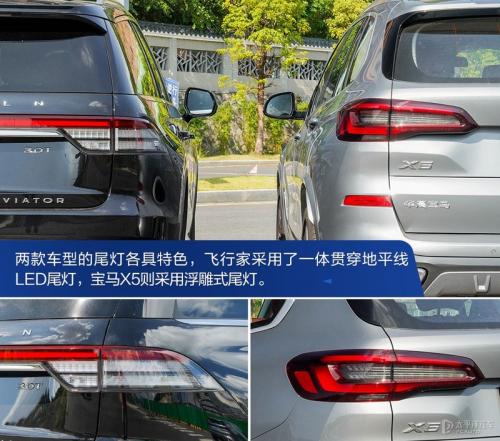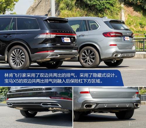 经典的一体贯穿式地平线LED尾灯让林肯飞行家的尾部更有层次感,横贯的设计配合宽大的车身,进一步增强了车尾的气场,给人四平八稳的感觉。宝马X5的车尾依旧是方正的造型,浮雕式尾灯配合多层折面的运用,营造出运动的氛围。