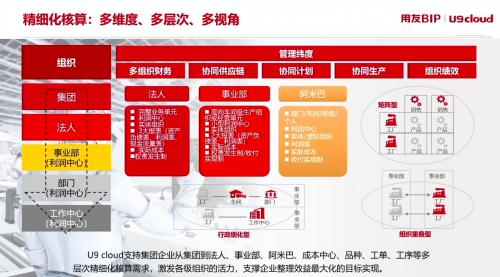 在这个过程中,我们推出了产品U9Cloud。我们ERP领域从横向上打通了整个产业链。面向下游客户,包括对客户的协同、技术的管理、第三方物流协同等等;产业链的上游而言,和供应链从产品试制的就可以开始进行协同,以及采购具体对接执行需求的下达、采购单的下达等等;企业内部的环节也分为几层,最上层的经营决策层可以做集团管控以及对决策的支撑,中间的运营管理层则围绕以订单交付、产品交付为核心的业务流程展开开展企业内部各环节的建设,下面是集成协同层,强调研发到制造的一体化、计划到制造的一体化等,最下面还有和现场生产的交互层。