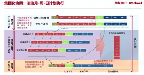 基于这个模式,他们内部的计划体系形成了三层。最上层基于预测和要货冲销以后的主计划,主计划不同期间内颗粒度不同,短期内按日,中长期按周,再长期按月,真正驱动执行的一般是一个月内。一方面驱动到内部的半成品计划,另一方面驱动到物料的供应计划,半成品计划和物料的供应计划也会有集成协同。