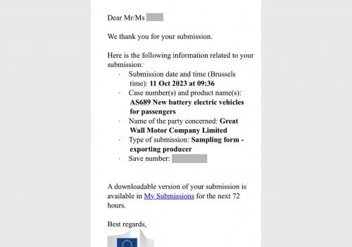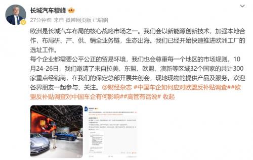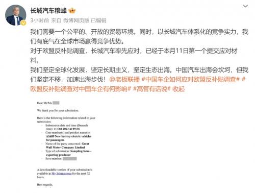 10月23日,有媒体在微博上向长城汽车总裁穆峰提问,“欧盟对中国电动汽车启动反补贴调查是否会减缓中国车企进入欧洲的脚步?”穆峰回应称,“对于欧盟反补贴调查,长城汽车率先应对,已经于本月11日第一个提交应对材料。中国汽车出海会坎坷,但我们坚定不移,加快出海步伐!”