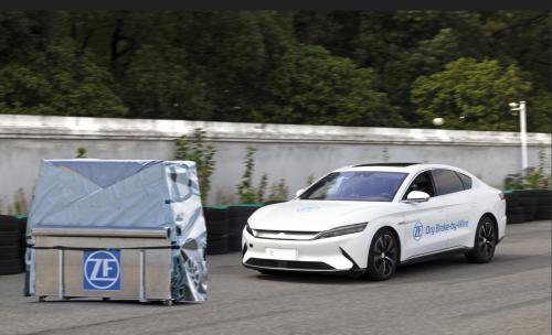 搭载新型干式线控制动系统的采埃孚展车在试验场障碍物前紧急刹车
