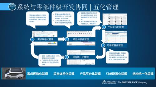 整个滑板底盘研发过程中,涉及到功能验证、性能验证、工艺制造验证等,这个过程会产生大量数据,要做各种各样的管理。为保证在规定时间内将滑板底盘开发出来,并对所开发的产品进行评估,我们希望对产品开发过程能够进行统一管控。下图是五化管理流程图,从需求规格化管理到项目体系化管理,再到产品平台化管理、订单配置化管理以及结构统一化管理,将滑板底盘产品开发的全过程统一在一个系统中进行管理。
