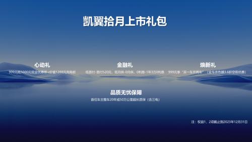 11月22日,凯翼汽车在四川成都举行新车上市发布会,定位为“大车级小旗舰”的新能源精品小车凯翼拾月正式上市,售价5.39-6.99万元,同时,购车用户还将享受心动礼、金融礼、焕新礼和品质无忧保障等四重上市礼包。