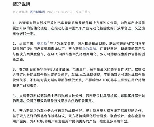 由于持续亏损,今年来屡传出华为计划分拆或是出售汽车业务的消息。同年8月,有消息称,华为有意推动车BU独立运营,并与重庆国资委密切接洽合作事宜。对此,华为官方立马辟谣,称“网上传闻与事实不符,并未与重庆国资委洽谈车BU相关事宜。”