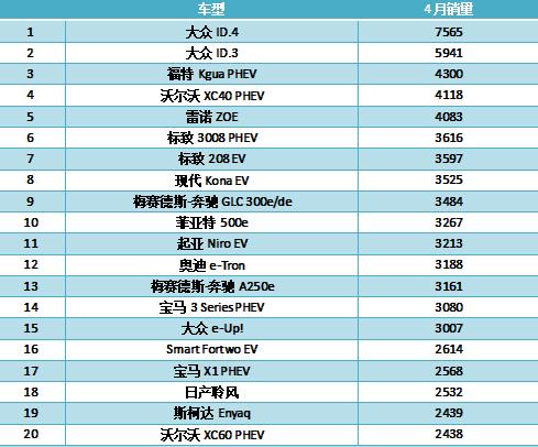 日前欧洲刚刚公布了4月份最受欢迎的新能源汽车排行榜,大众集团刚刚推出的纯电平台车型ID.4和ID.3摘得冠亚军,销量分别为7565辆和5941辆;福特Kgua PHEV收获季军,销量为4300辆。
