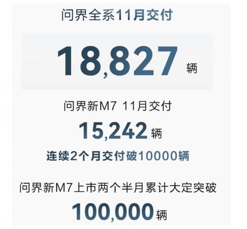 如果问谁是11月新势力造车的黑马,那无疑是问界了。今年11月,AITO问界系列共交付新车18827辆,其中问界最大功臣非新M7无疑,据悉新M7共计交付新车15242辆。AITO方面表示,为尽快将新车交付到用户手中,问界一直在提升交付能力,预计12月可交付新车23000辆,2024年起单月交付能力预计将达到30000辆。