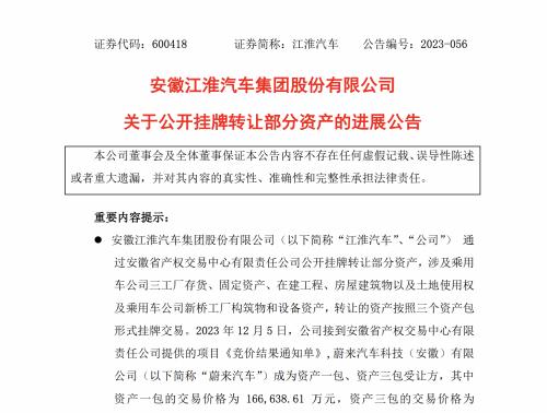 12月5日,江淮汽车发布公告称,接到公司接到安徽省产权交易中心有限责任公司提供的项目《竞价结果通知单》,蔚来汽车成为资产一包、资产三包受让方,合计交易价格为31.58亿元。
