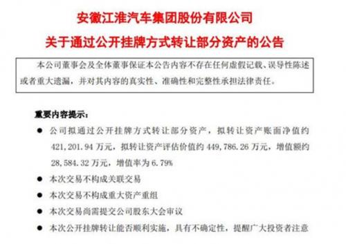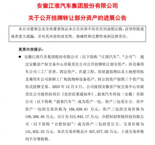 江淮汽车也在昨日发布《关于公开挂牌转让部分资产的进展公告。公告称,蔚来汽车成为资产一包、资产三包受让方,其中资产一包的交易价格为16.66亿元,资产三包的交易价格为14.92亿元,合计为31.58亿元;