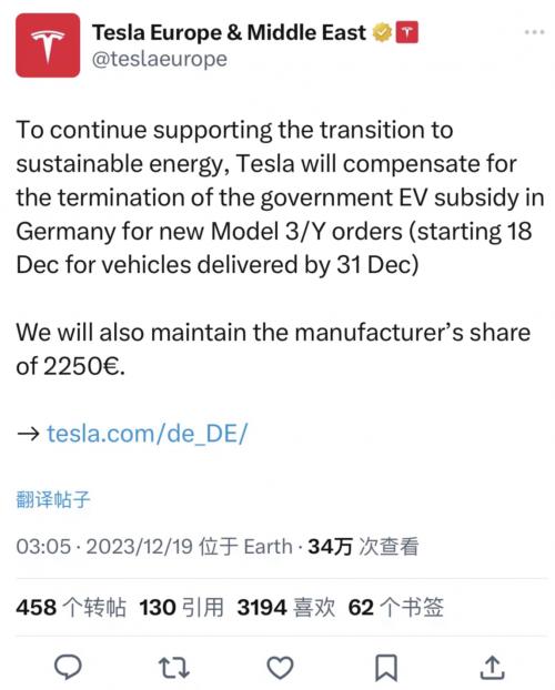 特斯拉在官方X账号发文称,“为了继续支持向可持续能源的过渡,特斯拉将对被德国政府终止补贴的Model 3和Model Y电动车进行补偿,补贴将从12月18日开始提供给12月31日之前交付的车辆,我们还将维持2250欧元的制造商份额。”