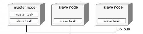 以氛围灯为例,传统的氛围灯主要通过LIN总线通信形式进行控制,采用的是单Master-多Slave模式,通过主控制器即主节点对各氛围灯模块进行节点分配与控制,达到点亮多个氛围灯模块、变换颜色等功能。