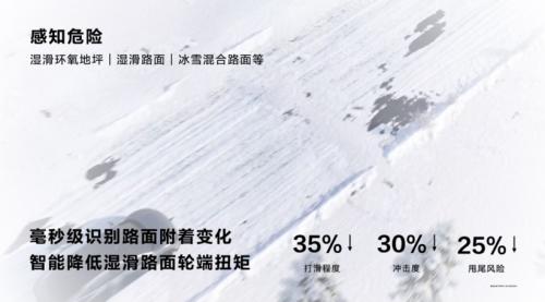 根据官方数据,在同样的环境下,智界S7发生侧滑的幅度可较之一般车辆下降35%、冲击度降低30%,发生甩尾的风险降低25%左右。