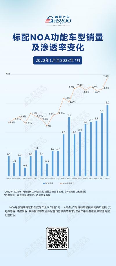 据盖世汽车研究院统计,今年7月,国内搭载NOA功能的车型销量约为5万辆,对应渗透率为2.8%,而去年同期只有1.4万辆,渗透率不足1%。1-7月,国内搭载NOA功能车型的总销量为26.4万辆,相较于去年同期大增196.6%。