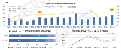 分价格区间来看,10-20万元区间车型,是L2的主力市场,上半年占比达到了44%。但从另一方面,由于这一价格区间新车体量较大,L2现阶段整体渗透率并不是很高,刚刚接近40%,还有较大的提升空间。