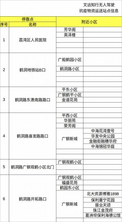 随着疫情的发展,广州市对疫情防控高风险地区开始进行封闭管理,尽管一日三餐的问题能保障,但老人小孩等特殊人群所需要的应急物资还是有所欠缺。从6月4日开始,无人驾驶车陆续抵达战场,为物资运送提供更好的保障。现收到无人驾驶车运送物资的站点信息,有需要的朋友可以把物资送往无人驾驶车始发地(鹤洞桥海珠区上桥位),能帮你把紧急物品送进疫区,无人驾驶车的营运时间大概为早上8点到晚上10点。