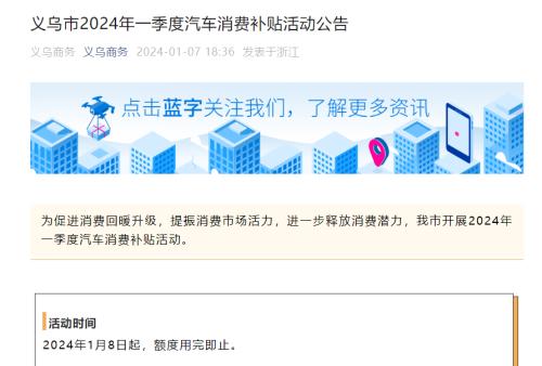 1月8日消息,据义务商务公众号显示,为促进消费回暖升级,提振消费市场活力,进一步释放消费潜力,义务市开展2024年一季度汽车消费补贴活动,补贴资金总额6000万元,活动时间为1月8日起,额度用完即止。