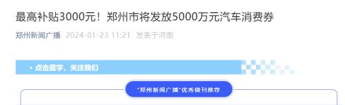 1月23日消息,据郑州新闻广播公众号显示,郑州市将开展2024年“腾龙焕新”双节汽车促消费活动,在郑州市范围内统一发放5000万元汽车消费券,最高可抢领3000元电子消费券。