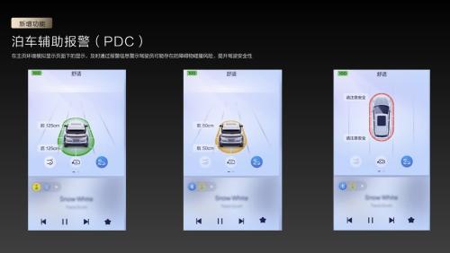 此外,还新增了泊车辅助报警(PDC)功能,在泊车时,主页会实时显示泊车环境,当车辆可能遇到碰撞风险时,系统会及时发出报警信息,提醒驾驶员注意潜在的障碍物碰撞风险,从而显著提升驾驶的安全性。