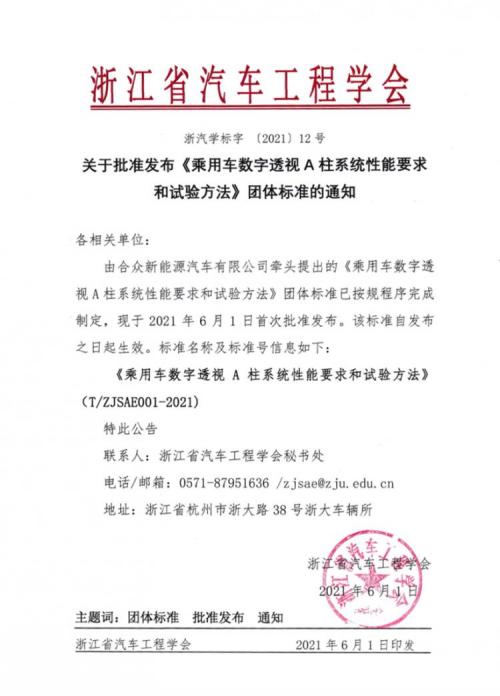 6月1日,浙江省汽车工程学会批准发布《乘用车数字透视A柱系统性能要求和试验方法》团体标准(以下简称《标准》)。通知中,浙江省汽车工程学会透露,由合众新能源汽车有限公司(以下简称“合众”)提出的《乘用车数字透视A柱系统性能要求和试验方法》已按程序完成制定,于6月1日首次批准发布,自发布之日起生效。有分析认为,该标准的出台将填补我国新能源汽车智能安全相关领域的技术标准空白。