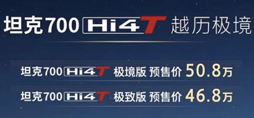 1月30日,坦克官方宣布坦克700 Hi4-T基础版正式开启预售。其中,极致版预售价格为46.8万元,极境版预售价格为50.8万元。