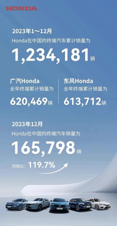 面对愈发内卷的市场以及电动化的冲击,本田中国2023年的业绩受到了较大影响。根据官方数据显示,本田2023年在中国市场的终端汽车累计销量为1234181辆,较2022年实现下滑10.1%。