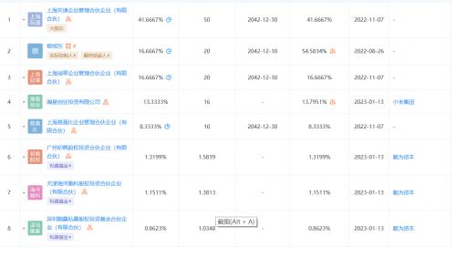 根据公告中的出资内容,新基金前两大股东将分别是小米武汉,出资30亿元,持股33.33%;北京市引导基金,出资20亿元,持股22.15%;而武汉金山同意出资5亿元。