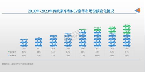 盖世汽车研究院整理的销量数据显示,2016年的国内汽车市场上,传统豪车的市场份额在6%上下,而这时候的国内新能源市场其实才刚刚起步,新能源豪华车的市场份额是零,因为当时根本还没有真正意义上的高端豪华新能源车。到了2023年,NEV豪华和传统豪华的市场份额基本上已经可以分庭抗礼,前者占比7.4%,后者在经历了此前几年超10%的高份额后,在电动车的冲击之下,份额已经回落至9.5%。