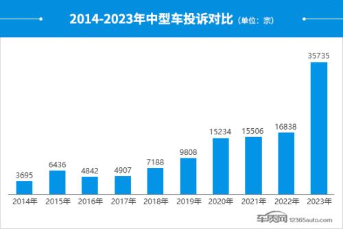 从2014-2023年中型车投诉量的变化情况来看,自2016年起开始连续同比增长,并在2020年和2023年两次出现同比跨越式增长,其中2023年投诉量同比涨幅更大,超过100%。