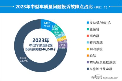 作为国内领先的缺陷汽车产品信息收集平台,车质网2023年共受理消费者针对汽车产品质量及服务问题有效投诉168,725宗(含第三方平台和后装轮胎投诉共102宗)。其中,中型车累计投诉量为35,735宗,同比上涨112.2%。从投诉占比情况来看,占年度投诉总量的21.2%,与2022年相比提高8.7个百分点。2023年中型车投诉中,共涉及68个汽车品牌旗下的124个车系,同比增加了8个品牌和15个车系,整体投诉回复率为94.9%,相比2022年降低了1.4个百分点。其中,有38个品牌的投诉回复率达到了100%,同比增加6个品牌。