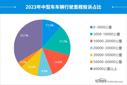 此外,在2023年中型车车辆行驶里程投诉统计中,行驶里程在0-3000公里和30000公里以上的投诉占比均有所降低,而行驶里程在3000-10000公里和10000-20000公里的投诉占比则出现明显提升,分别较2022年提高了3.4个和3.2个百分点。