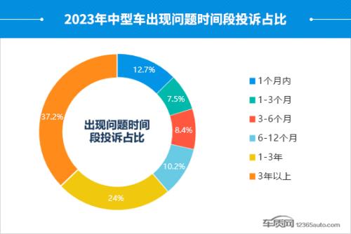 从2023年中型车出现问题时间段统计中可以看出,购车1-3年和3年以上的投诉问题占比依旧较大,两者占比之和已超过总量的六成。其中,购车1-3年的投诉占比较2022年提高了3.4个百分点;而购车3年以上的投诉占比较2022年下降了1.2个百分点。此外,购车1个月以内准新车的投诉占比相比2022年有所减少,降低了3.5个百分点。