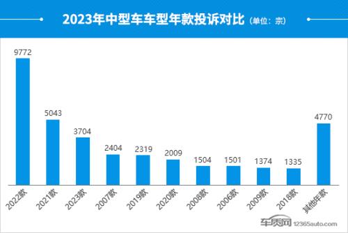 据车质网数据显示,在2023年国内中型车投诉中,2022款车型和2023款车型投诉量同比出现大幅增长,特别是后者,同比涨幅超过26倍,一跃成为投诉量排名第三位的年款车型。此外,2006款-2009款车型的投诉量同比也出现了不同程度增长,其中2007款车型投诉量首次突破2,000宗,排名跃升至第四位。从2023年中型车车型年款投诉情况来看,老款车型问题明显增多,而新款车型口碑持续向好。