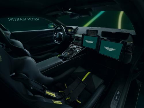 全新Vantage安全车内部配备了各种控制系统,旨在帮助驾驶员和乘客履行各自的职责。为了保障安全车车手贝恩德*梅兰德及其乘客在高速行驶时的稳定性,量产座椅被赛车座椅所取代。中控台经过精心定制,配备了开关设备用于操作FIA系统,并设有实时圈速显示、赛道上所有车辆的位置追踪以及后视摄像头屏幕,确保驾驶员全面掌握赛道动态。虽然功能强大,但全新Vantage安全车仍不失为一款典型的阿斯顿*马丁座驾,内饰采用独特的青柠色饰条,向品牌自身的赛车致敬。